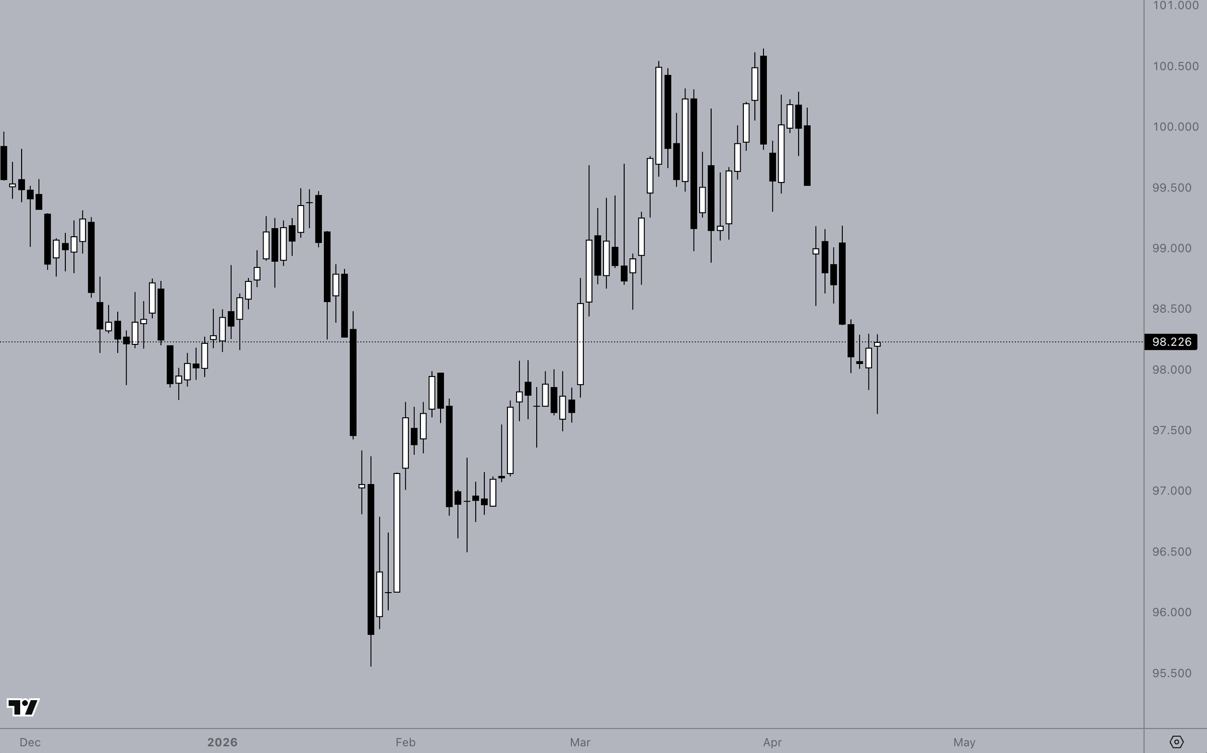 DXY gained +0.45% over 5 days to 98.17 on Warsh hawkishness and strong US data. But Asset Managers liquidated 5,024 longs while UUP saw -$197M monthly outflows. This is a "thin" rally driven by short covering, not institutional accumulation. April seasonal headwind remains. Bias is neutral to bearish below 98.39.