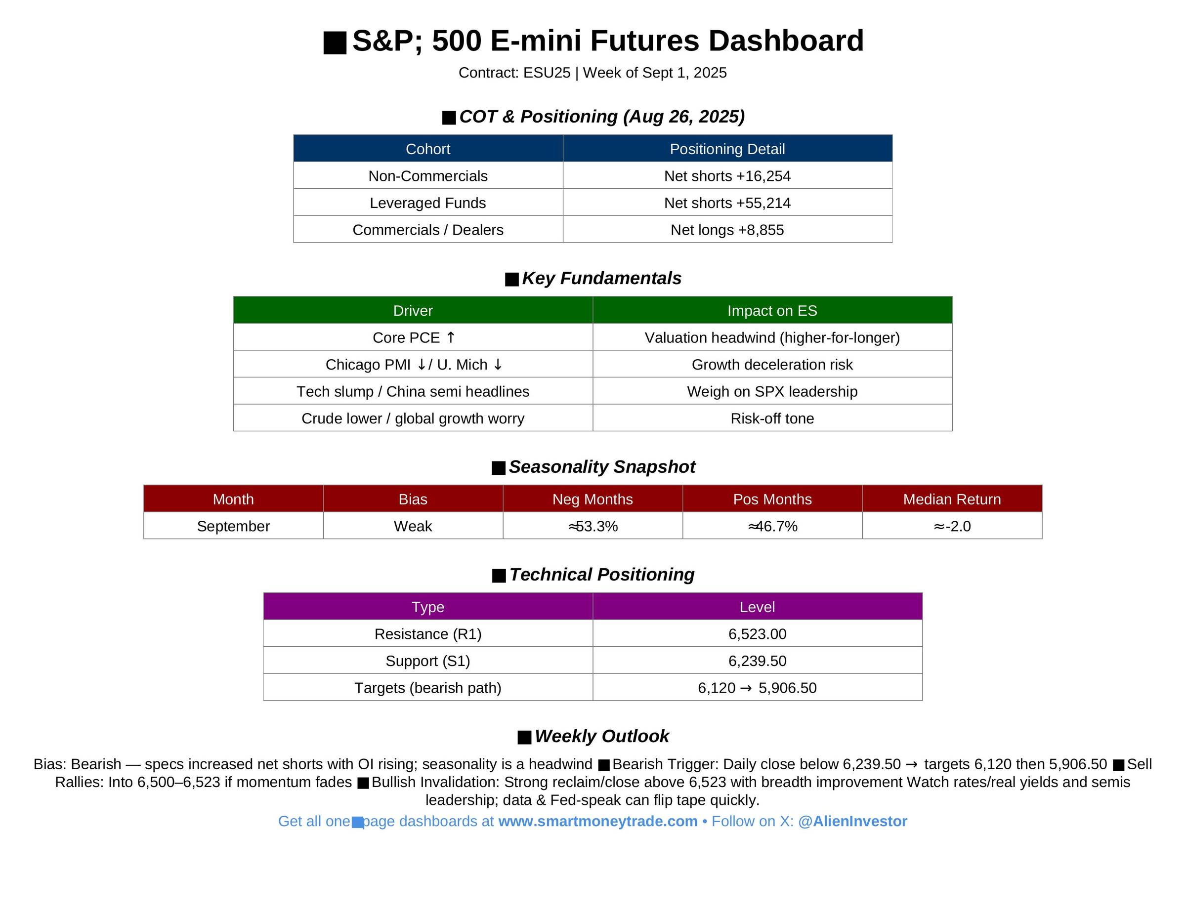 The setup leans bearish: specs pressed shorts, OI rose, macro is softening, and September seasonals bite. Iโm inclined to sell strength into 6,500โ6,523 and add only on a clean break of 6,239.50. Bulls need a firm reclaim of 6,523 plus better macro tone to flip the bias.